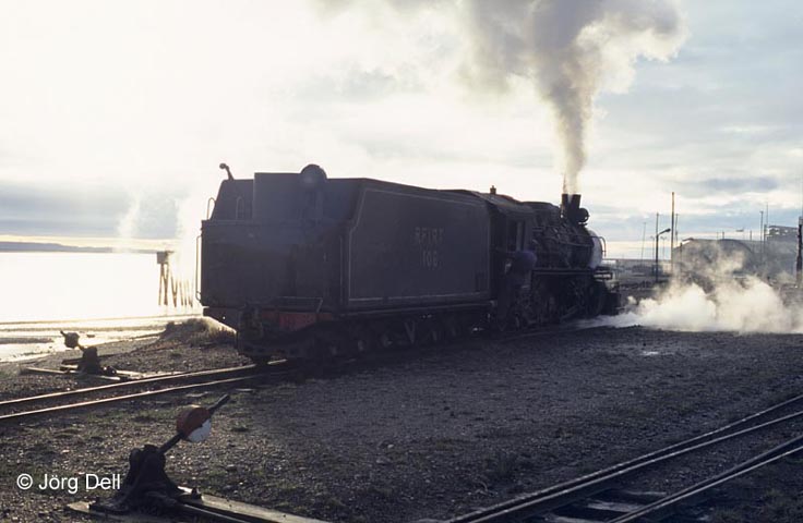 Endlich freundlicheres Wetter am Morgen des 28.3.: Nr. 104 verlässt das direkt am Wasser gelegene Depot.