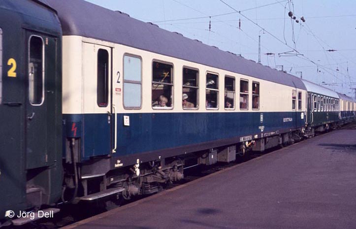 Zu jener Zeit lief einer der beiden Frankfurter Büffetwagen der Baureihe BRbumh282 in der auch sonst sehr illustren Garnitur des E251 Frankfurt-Prag. Der Zug, der neben CSD-Wagen auch SNCF-Kurswagen aus Paris mitführte, lief tatsächlich bis Nürnberg nur als Eilzug und erst ab dort als D251 (Foto zeigt 85-40 015 im Bf. Hanau am 3.7.83).