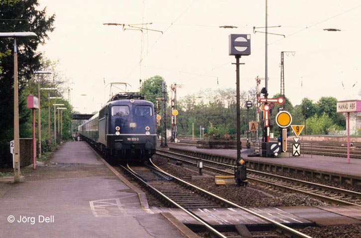 110 323 fährt am 9.5.86 mit einem Eilzug nach Gleis 1 ein.