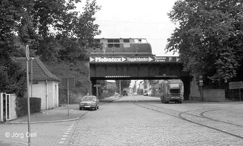 Blick von der Wanheimer Str. auf die von Rheinhausen kommende Strecke mit 221 125. Die Straßenbahngleise sind hier leider schon lange nicht mehr in Betrieb.