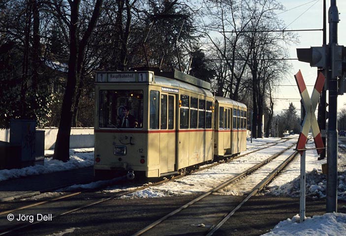 18.2.91: Tw 12 + Bw 182 auf der Heidelberger Landstraße, ...