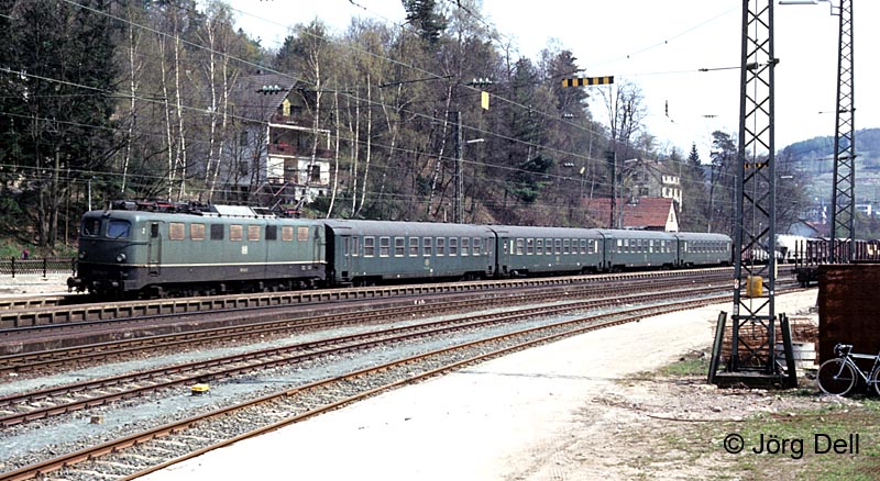 Noch eine Überführung: vier SNCB Wagen passieren am 26.04.1984 hinter 150 041 den Bahnhof Heigenbrücken