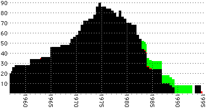 The picture below shows the number of TEE trains running each season (summer or winter) from 1957 to 1995, a pair counts as two. For ease of reference it includes a grid. The horizontal lines are put at 10 trains with a dot for each season, the vertical lines are put at 5 years with a dot for each 2 trains. The dashes at the bottom mark the start of the summer season for each year. Trains shown in red are without counterpart (running one-way only), the green trains are the Lufthansa Airport Express trains that are not really TEE trains. Note that sometimes changes occur during a season, these are always put halfway the season. Also the vertical lines are set off a bit agains the real start of the season to avoid confusion with staggered edges.