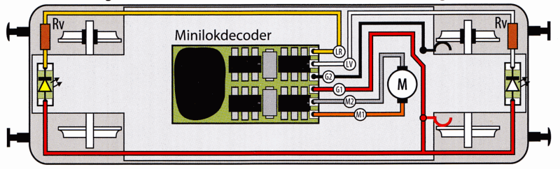 Decoderen (som følger standarden NEM 651) og toget og dets forbindelser kan ses på nedenstående tegning: