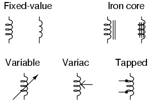 Spoler kan indeholde en jernkerne, som gør, at dens værdi bliver større. Og det er det, der er indikeret ved stregerne i eller ved spolen. Alt efter størrelse, både fysisk, ud fra værdi men også ud fra effekt (sær strøm), har de to forskellige udseender; pakket ind ligesom en modstand og som "rigtige" spoler: