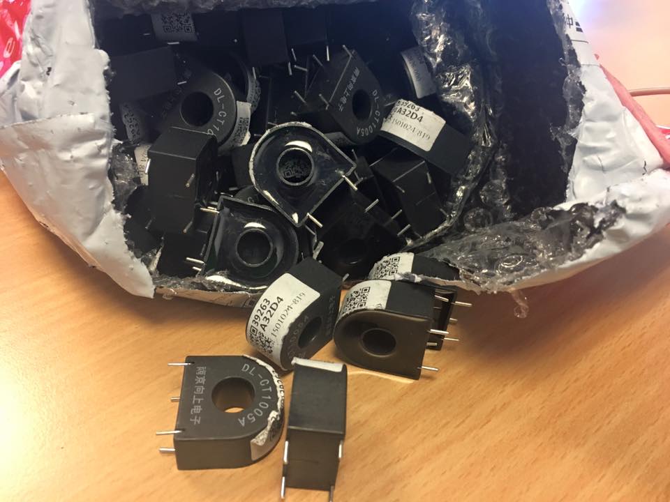 De skal bruges på en lidt speciel måde, men først en beskrivelse: Komponenten hedder dl-ct1005a, og det er en simpel spole. Der er fire ben på, men kun to af dem har forbindelse til spolen indeni - de to andre giver stabilitet, når den er loddet fast på printet. Databladet fortæller, at den kan klare 10 ampere og har en modstand på 205 Ω. Omsætningsforholdet er 2000:1. Og den er 18 mm. i længden, 10,2 mm. bredden og 19 mm. i højden.