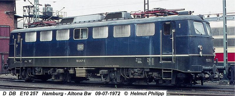 | Vesttyske DB's persontogslokomotiv af typen BR 110 med sølvgråt tag med tagrende | |||