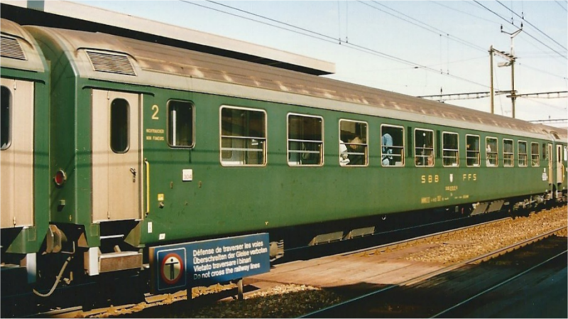 | Schweiziske SBB's 2. kl. UIC-RIC personvogn med gammelt logo og computernummer | |||