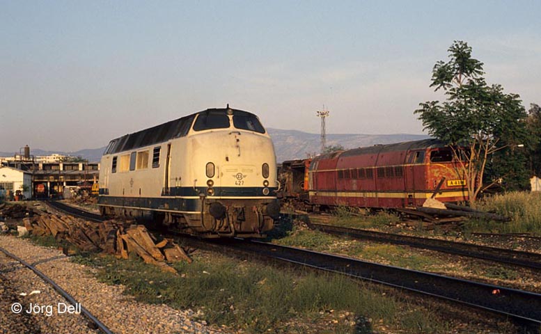A427 fährt am Lokkasten der A410 vorbei, die Jung 1966 mit der Fabriknummer 13995 gebaut hat. Die zehn Loks der Reihe A401-410 waren die größten, die Jung je gebaut hat. Zum Zeitpunkt unseres Besuchs war zwar keine mehr in Betrieb, aber alle 10 noch vorhanden.