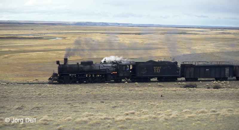 Der selbe Zug bei Las Buitreras in der typischen Landschaft Süd-Patagoniens.