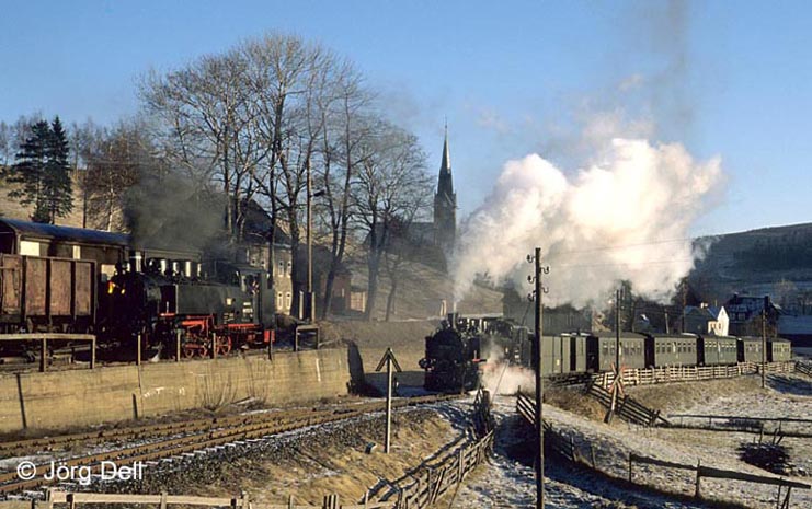 Weiter geht es mit der Fichtelbergbahn Cranzahl-Oberwiesenthal, auf der zum Zeitpunkt meines Besuchs nicht weniger als dreieinhalb Güterzugpaare täglich unterwegs waren! Allerdings fuhren nur eineinhalb davon zu Tageslichtzeiten. Das Foto zeigt 99 1772 bei ihren Rangierarbeiten in Hammerunterwiesenthal, während 99 1788 mit einem Pz einfährt (10.2.1990).