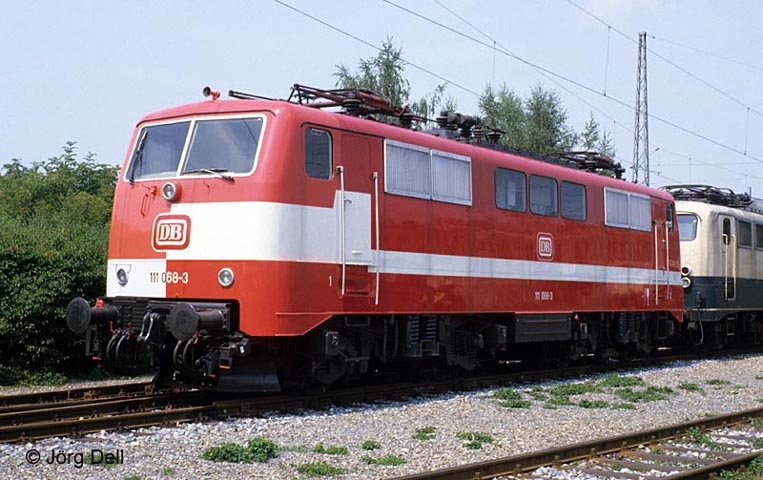 Beim Tag der offenen Tür im AW Freimann am 30.7.86 zeigte sich im Freigelände die 111 068 mit ihren schachbrettmusterartigen Farbversuchen. Leider hatte ich die 069, an der ebenfalls fürs neue Farbkonzept herumprobiert wurde, nicht zu Gesicht bekommen.