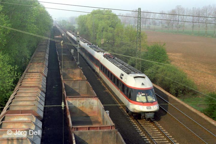 Während der Hannover-Messe 1981 wurde das Zugpaar M1190/1191 „Messe-Favorit“ (Stuttgart-Hannover Messebf. u. z.) mit einer sechsteiligen Einheit der Baureihe 403/404 gefahren - hier der M1190 an der westlichen Einfahrt des Bahnhofs Gelnhausen am 5.4.1981.