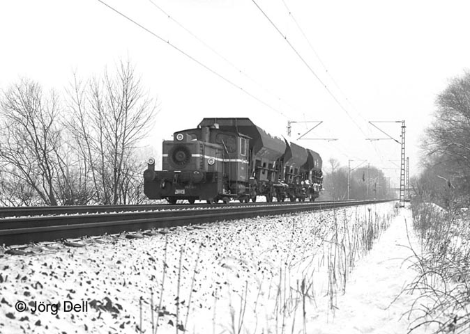Die Gelnhäuser Bahnhofslok 333 181 kam gelegentlich mit Übergaben zu Hauptbahnehren, wie hier am 8.1.85 zwischen Gelnhausen und Hailer.