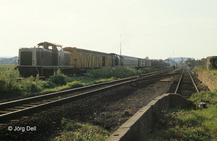 Bei der Militärverladung am 28.9.84 hat ein Panzer bei der Überfahrt zum nächsten Flachwagen ein Drehgestell aus dem Gleis gehebelt, so dass der Giessener Hilfszug anrücken musste (211 193 und 211 126).