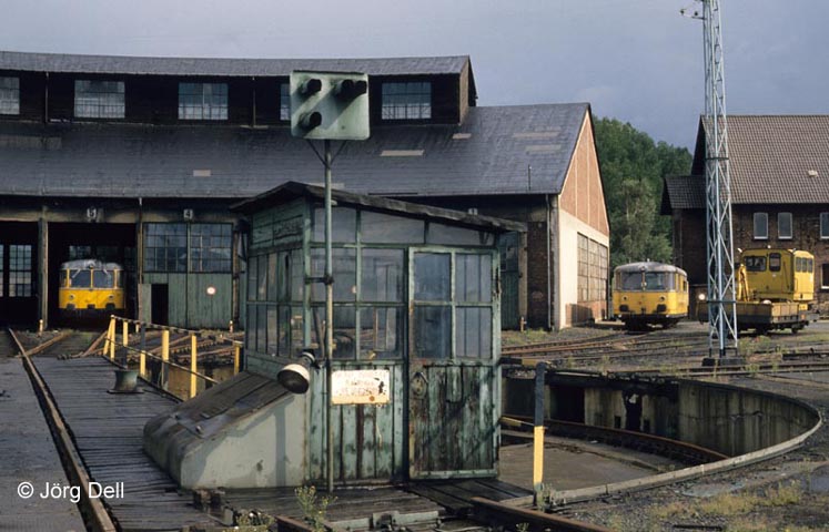 Während der von Hanau aus eingesetzte Gleismesszug 725+726 002 an seinem Stammplatz, im Lokschuppen des Bw Hanau, stand, weilte am 28.8.89 auch der Indusi-Messwagen 728 001 im Bw.